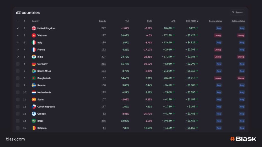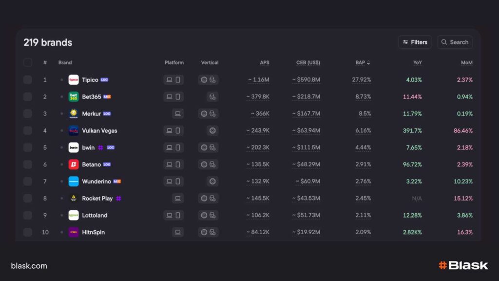 Click a market in Countries and Blask opens a Brands table that exposes each operator’s real standing: platform mix, vertical focus, hourly Blask Index, monthly APS / CEB, and BAP, the share-of-attention metric built from search, visibility and competitive crowding.