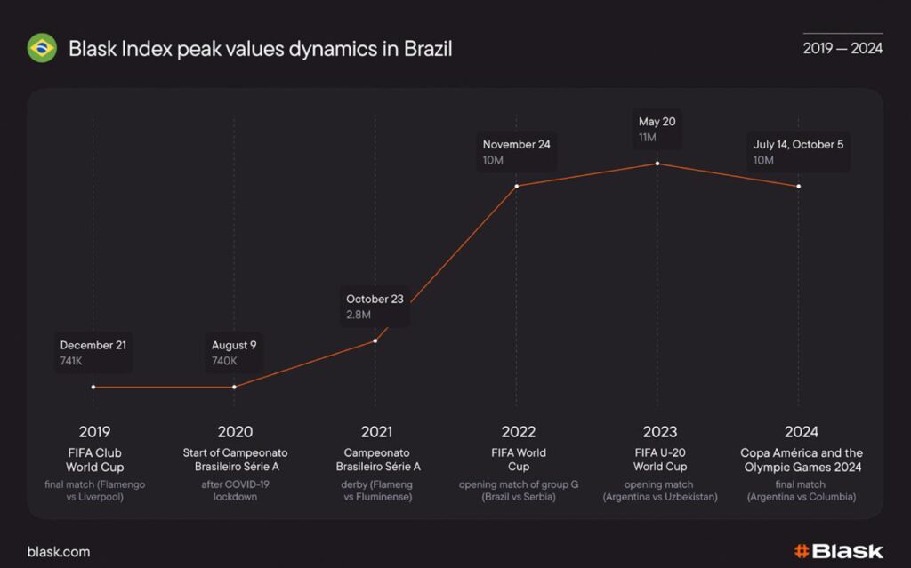 - Brazil. Football rules, but the magnet changes: Club World Cup final 2019 (741 K), delayed Brasileirão restart 2020 (740K), Flamengo-Flu derby 2021 (2.8M), first World-Cup match 2022 (10 M), U-20 World Cup opener 2023 (11M) and the Copa América final + Paris Olympics double-peak 2024 (10M).