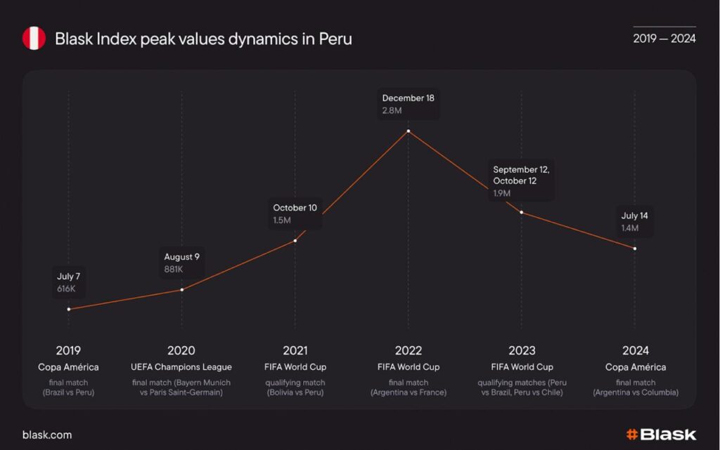 - Peru. National-team moments move the needle: Copa América final 2019 (616K), Bolivia WC-qualifier 2021 (1.5M), Argentina–France WC final 2022 (2.8M) and Copa América final 2024 (1.4 M).
