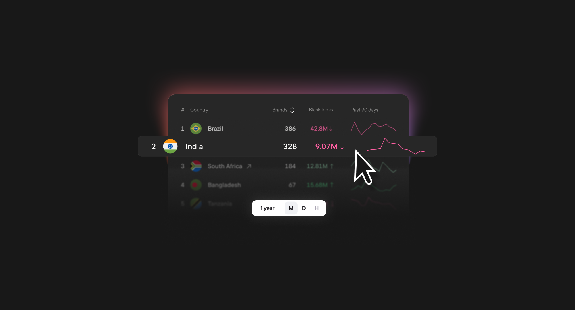 Click a market in Countries and Blask opens a Brands table that exposes each operator’s real standing: platform mix, vertical focus, hourly Blask Index, monthly APS / CEB, and BAP, the share-of-attention metric built from search, visibility and competitive crowding.