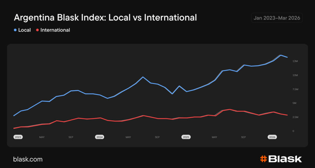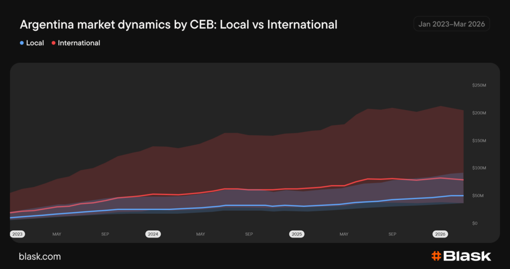 Argentina’s Blask Index rose nearly 4.5x from January 2023 to March 2026. Licensed brands captured most of that growth. Offshore brands’ share of Blask Index peaked at 27.9% in January 2024 and fell to 18.5% by March 2026.