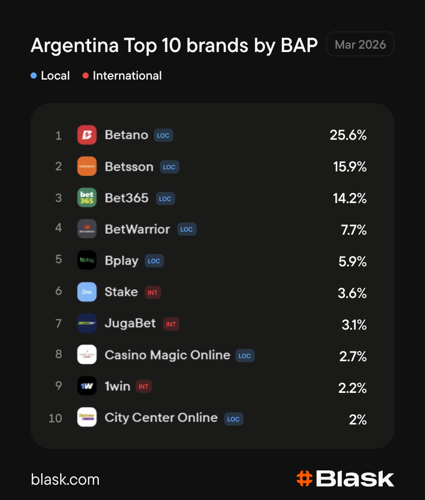 The current market leader by BAP (Brand Accumulated Power, share of country’s Blask Index) is Betano, which officially entered the Argentine market only in early 2024. By March 2026, its BAP reached 25.6%. That means Betano’s share of iGaming demand in Argentina went from zero to a quarter of market total in just 26 months.