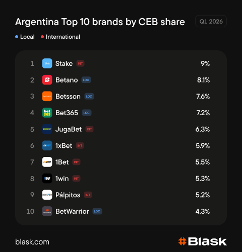 The market leader by CEB is Stake — an offshore operator. It ranked sixth by BAP in Q1 2026 and held 9% of Argentina’s total projected revenue. Betano, first by demand, held 8.1%. Only 4 brands among the top 10 by CEB in Argentina are operating with local licenses — a complete opposite picture to BAP ratings.