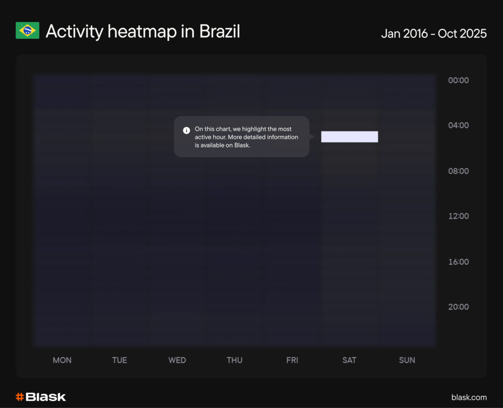 - Hour of day: the “hot window” is Saturday night into early Sunday (UTC), which translates to roughly 01:00–03:00 BRT for most of Brazil. That is exactly when live matches, in-play betting and longer sessions stack up.