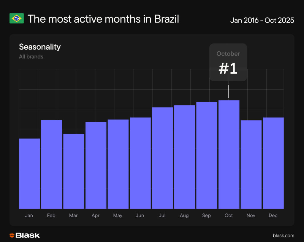 In Blask’s long-range seasonality (2016–2025), October is historically the most popular month. That’s no accident — it sits at the crossroads of Brazil’s domestic and continental football: