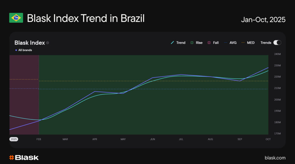 From January to October 2025, the Trend line of Brazil’s Blask Index rose by roughly 32% (from ~174M to ~230M). In plain sight, the chart looks like a staircase: a winter trough, a steady spring climb, a brief September cooling, and an October re-acceleration.