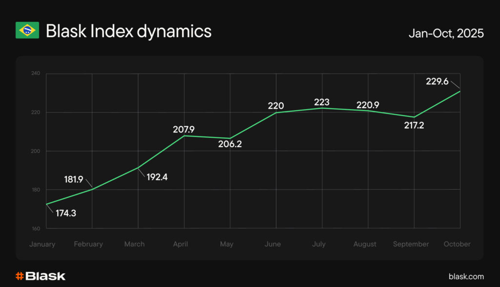After a January dip around the regulatory launch, the market rebounded quickly and resumed an upward line by autumn. On Blask’s 2025 chart: 174.3M in January → 229.6M in October (about +32% over ten months), with a routine seasonal soft patch in Q1 and a rotation higher thereafter. The headline: demand returned and held into year-end.