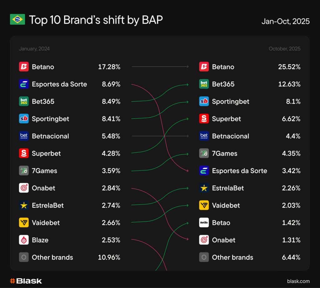 - Betano widened its lead: 17.28% → 25.52% (Jan → Oct).