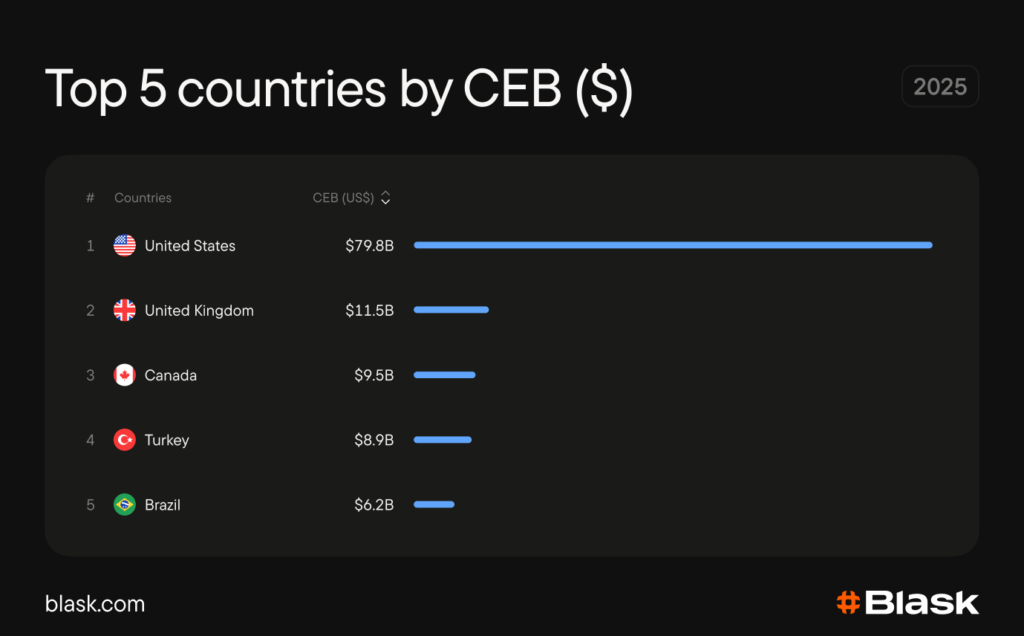 Canada’s total online gambling market reached approximately $9.5B in CEB in 2025, placing it third globally behind only the US and the UK, with the fastest year-on-year growth among the global top five.