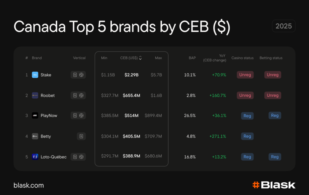 Offshore operators account for the majority of that volume — and the gap is widening. In 2025, offshore CEB grew 40%, against 23% for domestic brands. 230 brands compete for Canadian players. The top two by CEB are Stake and Roobet, both unregulated.