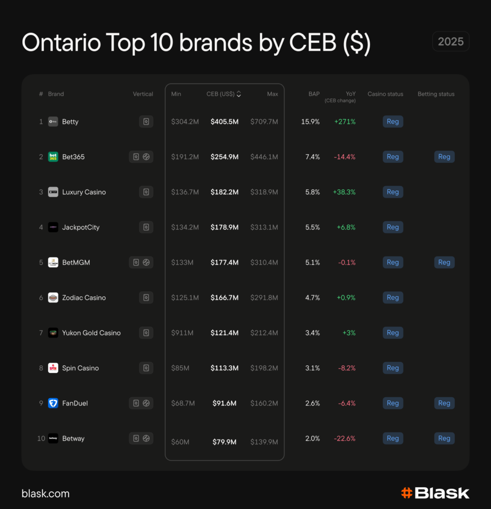 Ontario’s CEB in 2025 was $3.1B. Treated as a standalone country, it would rank 12th by CEB, between Japan and Germany. All top ten Ontario brands by CEB in 2025 were licensed, casino-only operators dominated the top of the table.