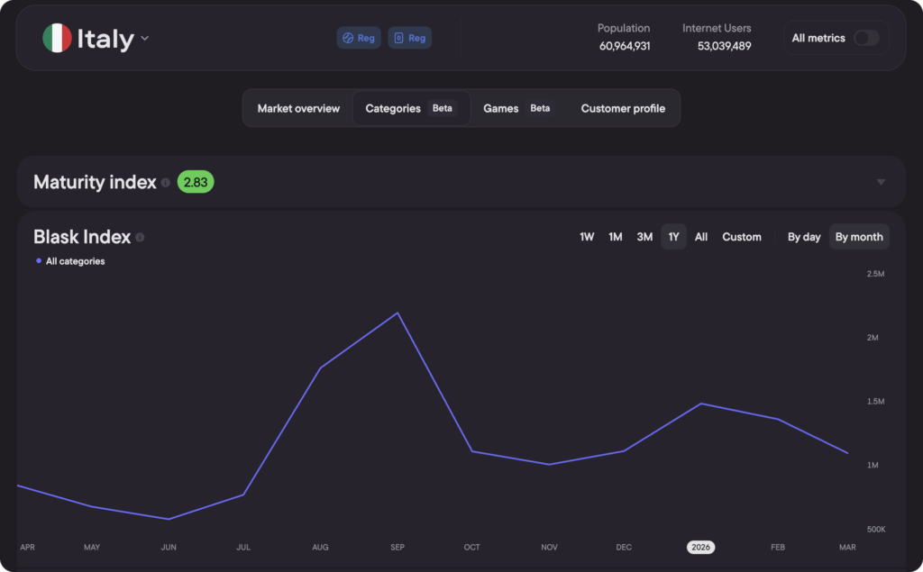 The number at the top of the Categories tab is the Maturity Index. It measures how users in a country search for iGaming products — through generic category queries (“online casino”, “scommesse calcio”) or through specific operator names. The underlying calculation is a ratio of total category search volume to total brand search volume, normalized to a 0–100 scale.