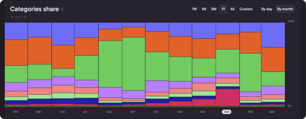 The second visualization is a stacked bar chart showing each category’s share of total demand by month. It works the same way the BAP chart works for brands: rather than absolute numbers, it shows how the demand pie divides between activity types and how that split shifts over time.