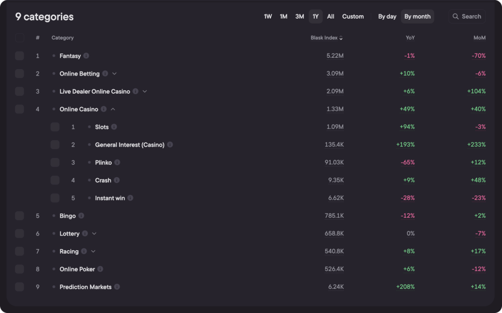The Categories tab measures something different from the brand side of Blask. Where brand metrics track how much users search for a specific operator, Categories captures direct category search intent — queries that express interest in a game type or activity, not a brand.