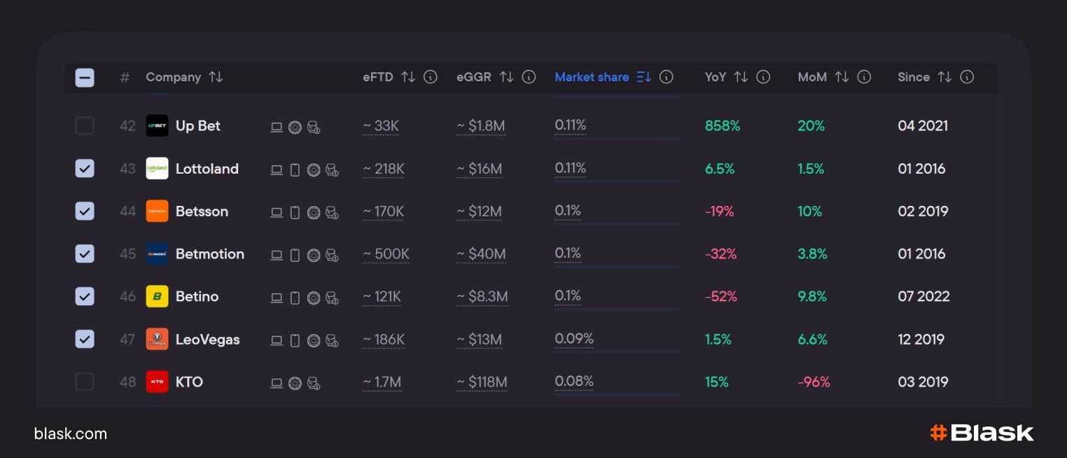 Blask enables iGaming companies to easily compare countries and markets through its comprehensive data and analytics platform. With Blask, users can access real-time market share data, track competitor performance, and analyze industry trends across multiple countries simultaneously.