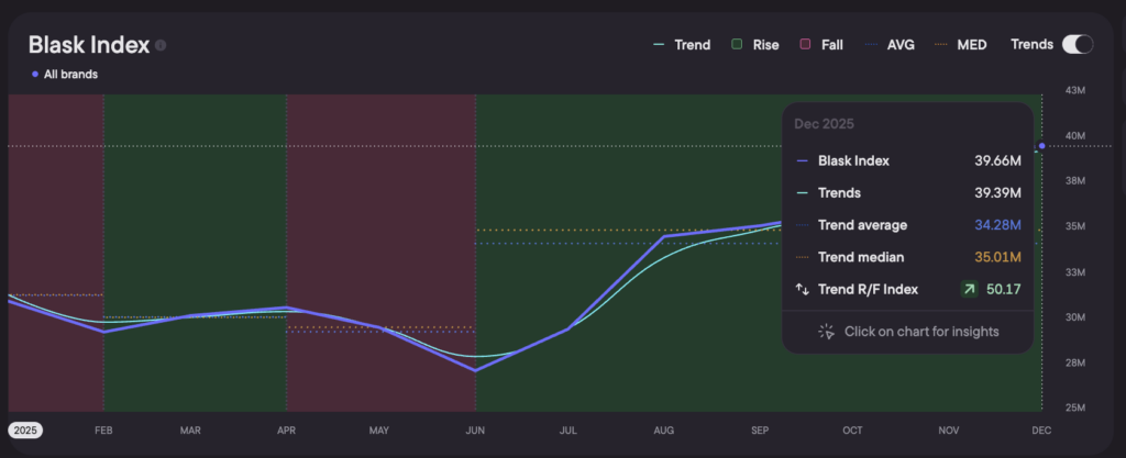 - Demand momentum – Blask Index chart traces search interest for the markets. A rising line means appetite is still expanding; a flat or sagging curve warns that enthusiasm is cooling.