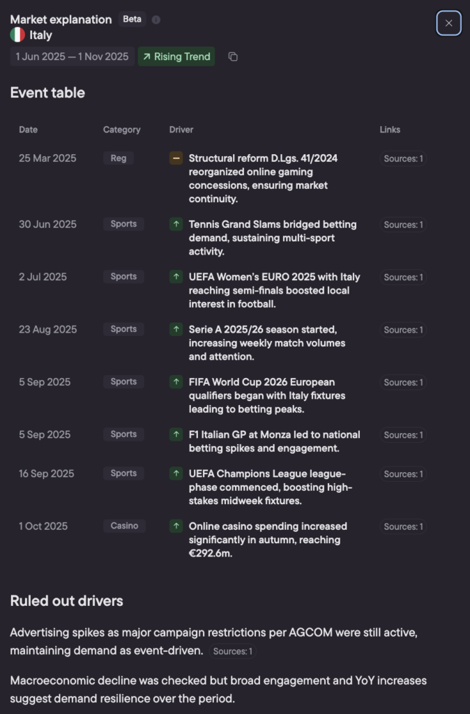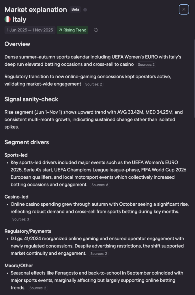 When a trend turns green or red, you can open Market Explanation to see a structured summary of the key events that influenced the market in that period — the fastest way to validate whether a move is driven by sport calendars, regulation, payments friction, blocking, or cultural seasonality.