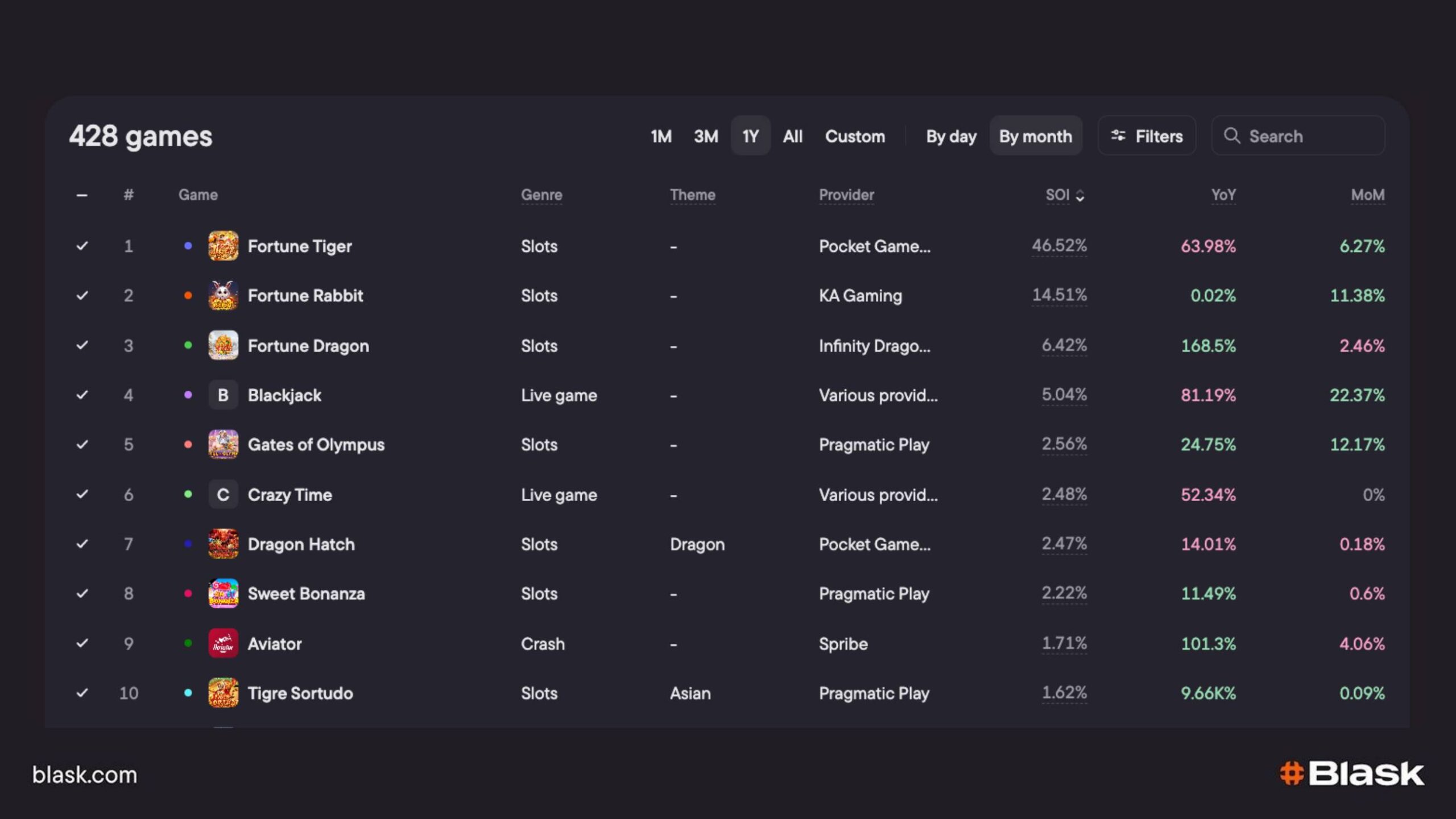 Placement lives in the Avg Lobby GVR widget; player appetite lives in the Blask Index / Share-of-Interest widgets just below it. Blask lets you see at a glance whether a title is well-positioned and whether anyone still cares.