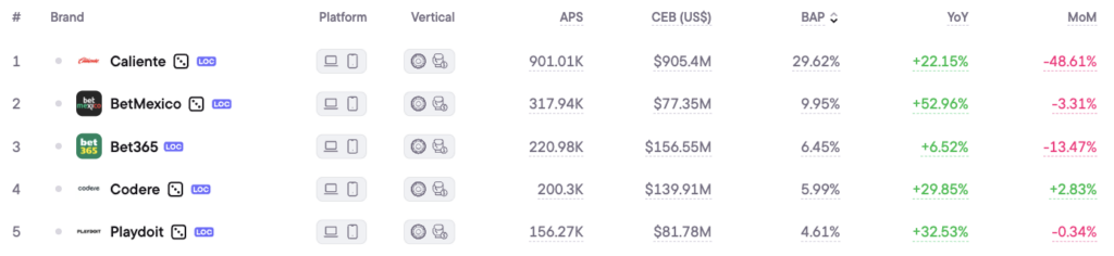 The top brand, Caliente, grew its Blask Index 26.5% year-over-year. Its month-over-month growth in December 2025 reached 55.2%, suggesting the acceleration is still building rather than peaking.