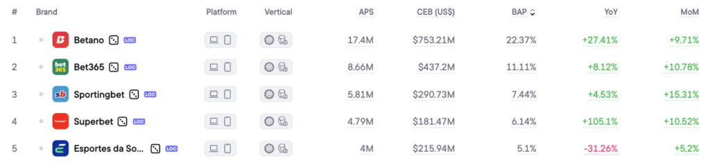 The question for 2026 is how fast the licensed brands compete for the demand that’s now theirs to capture. The #1 brand, Betano, grew 21.1% YoY. Bet365 holds #2 with an APS of 8.2 million new customers per year.