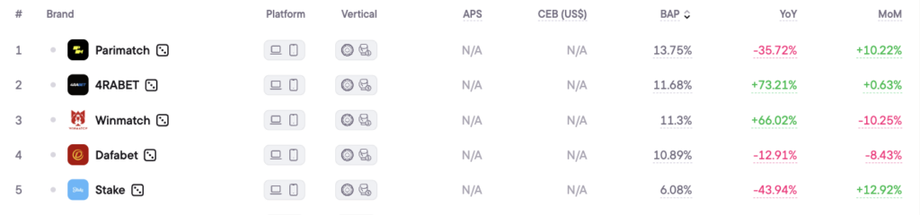 The competitive structure in India is still fluid. The top brand, 4RABET, posted +73% Blask Index growth year-over-year — the highest single-brand growth rate of any major brand across all five markets. That kind of outlier performance signals an early-mover advantage playing out in real time: one brand capturing a disproportionate share of a market that is still deciding who it belongs to.
