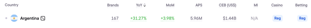 Argentina grew 25.2% by CEB to $1.44B ($846M–$3.21B range), with APS up 24.1% to 5.96M (range: 4.1M–11.7M). The story is regulatory expansion.