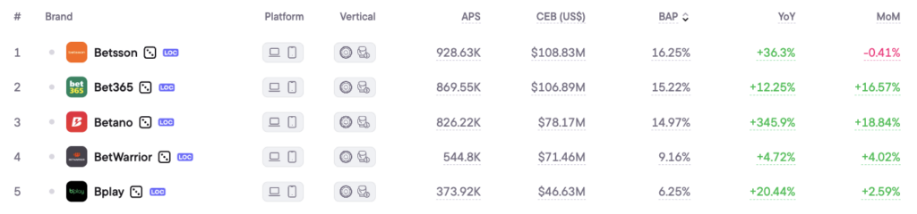 Betano’s 329.6% year-over-year Blask Index growth in Argentina illustrates how quickly new entrants can capture share in a market still defining its structure. Betsson, the market leader, grew a steadier 30%. Bet365 grew just 0.1% — evidence that scale alone doesn’t guarantee growth when focused challengers move faster.