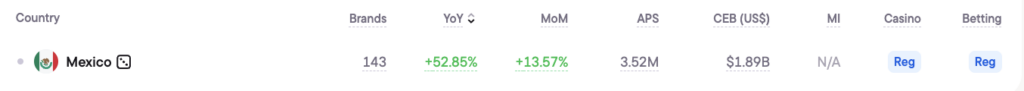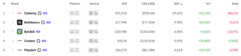 Caliente, the market’s top brand, grew 26.5% year-over-year by Blask demand. BetMexico, the second-ranked operator, grew 68.3% — a faster trajectory from a smaller base.