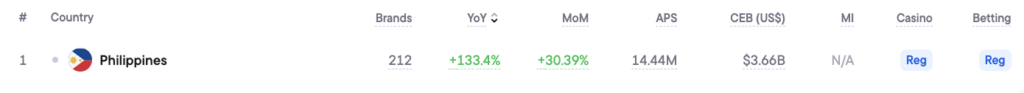With 212 active brands tracked in the Philippines, it’s also one of the more competitive markets in the region — operators who moved early are already consolidating share while latecomers fight for what remains.
