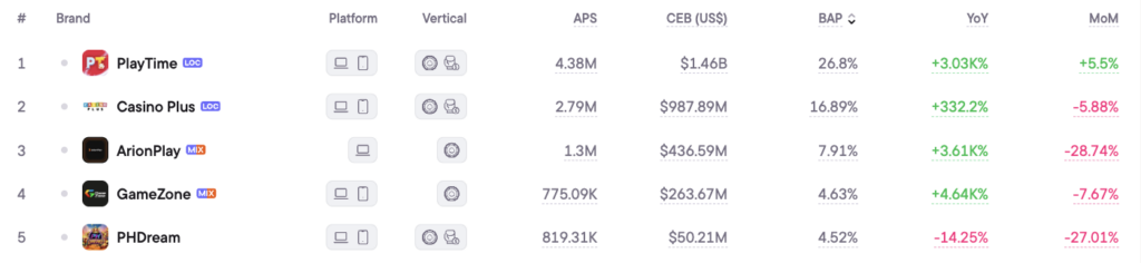 The brand-level data reflects this compression. PlayTime, the market’s top brand by Blask demand, posted 3% YoY Blask Index growth. GameZone, ranked fourth, grew 4,64%. These aren’t niche operators catching a short-term wave. They’re capturing players who previously sat outside the regulated market entirely.