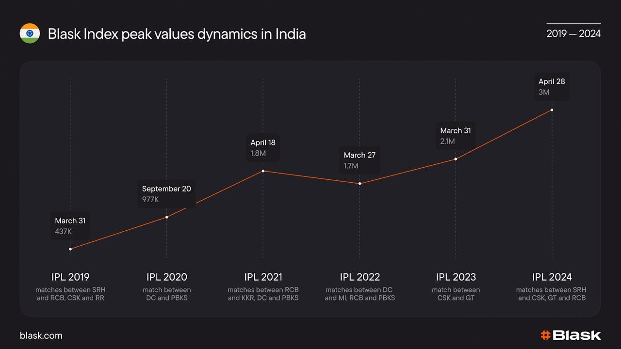 | India | 3 M Index points on mid-table IPL double-header (Apr 2024) | IPL | Spikes grow every season and cluster on double-headers, not on the opener or final. |
