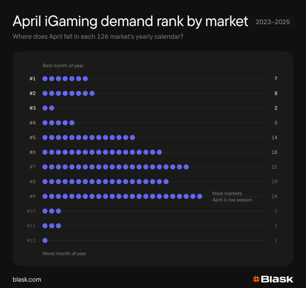 Blask seasonality data shows that April is a mid-low month in terms of iGaming demand. Yet it ranks among the top 3 months of the year significantly more often than among the bottom 3. And in several markets where April is the strongest month of the year, it is driven by specific events — like cricket in India or the national football and rugby tournaments in Australia.