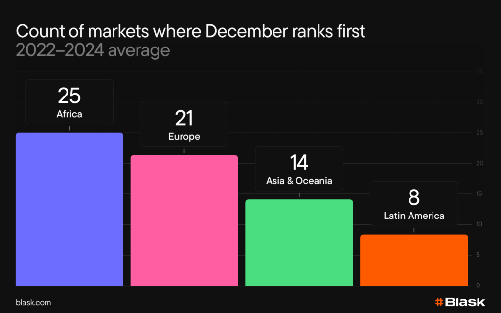 Across the 112 markets we currently track, December topped Blask Index in 45 countries in 2022, 56 in 2023, and 43 in 2024. On a 2022–24 average, it ranks first in 68 markets and sits within the top three in 93.