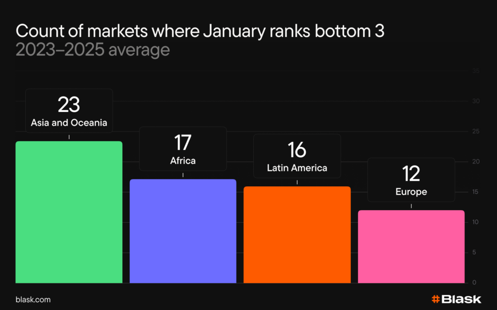 January is widely treated as iGaJanuary is weak often enough to deserve its reputation. Yet in many markets it sits in the middle of the yearly ranking, and in a smaller group concentrated in Europe, it even lands in the top half.ming’s low season. Blask data across the 123 markets tracked at the end of 2025 backs that up. Yet in nearly 19% of markets, January still ranks in the top half of the year by Blask Index — and Europe accounts for most of them.