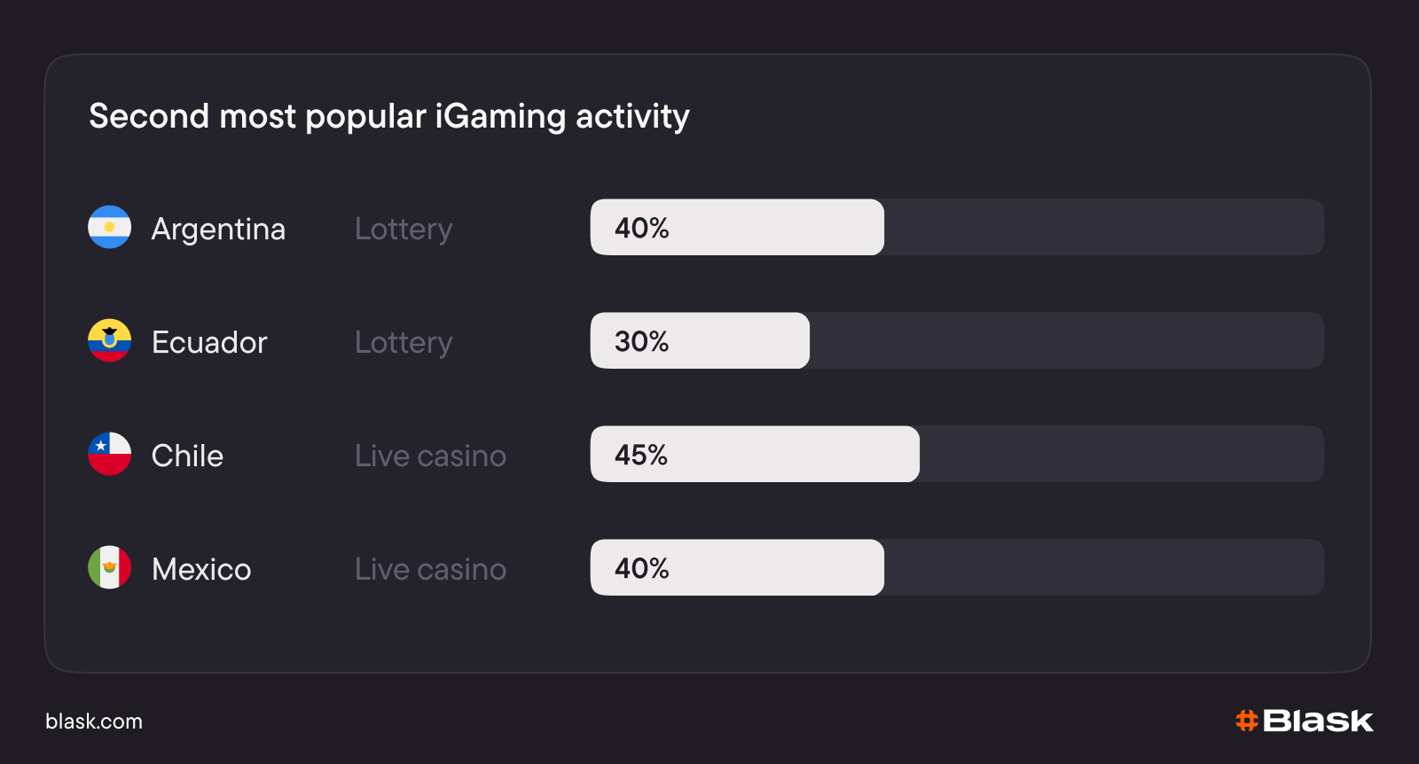 - In Ecuador, 40% of players seek an adrenaline rush.