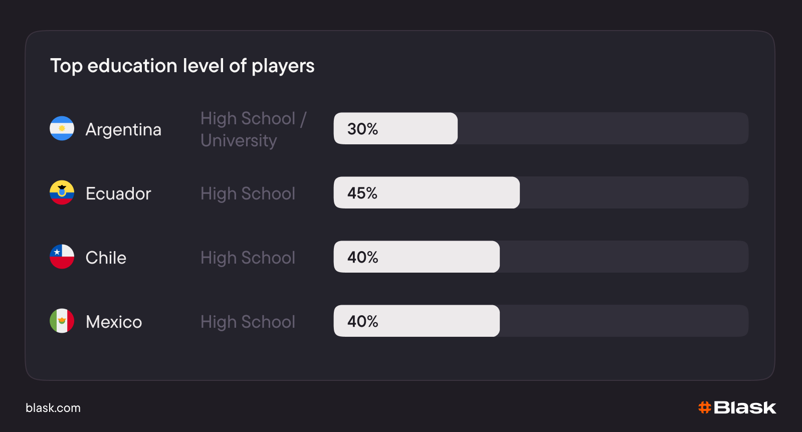 In Argentina, leadership is shared equally between two categories: High School and University, each accounting for 30%. In other countries, the majority of players have only completed high school.