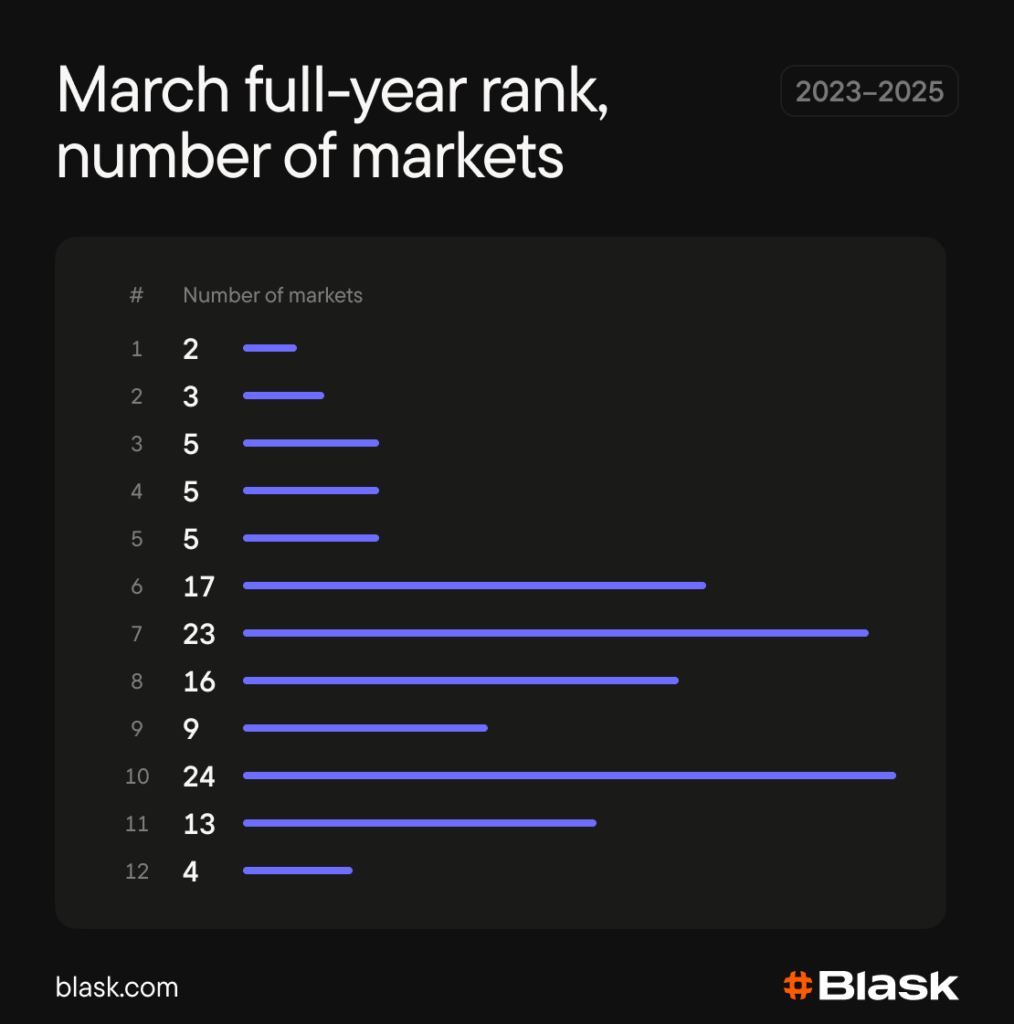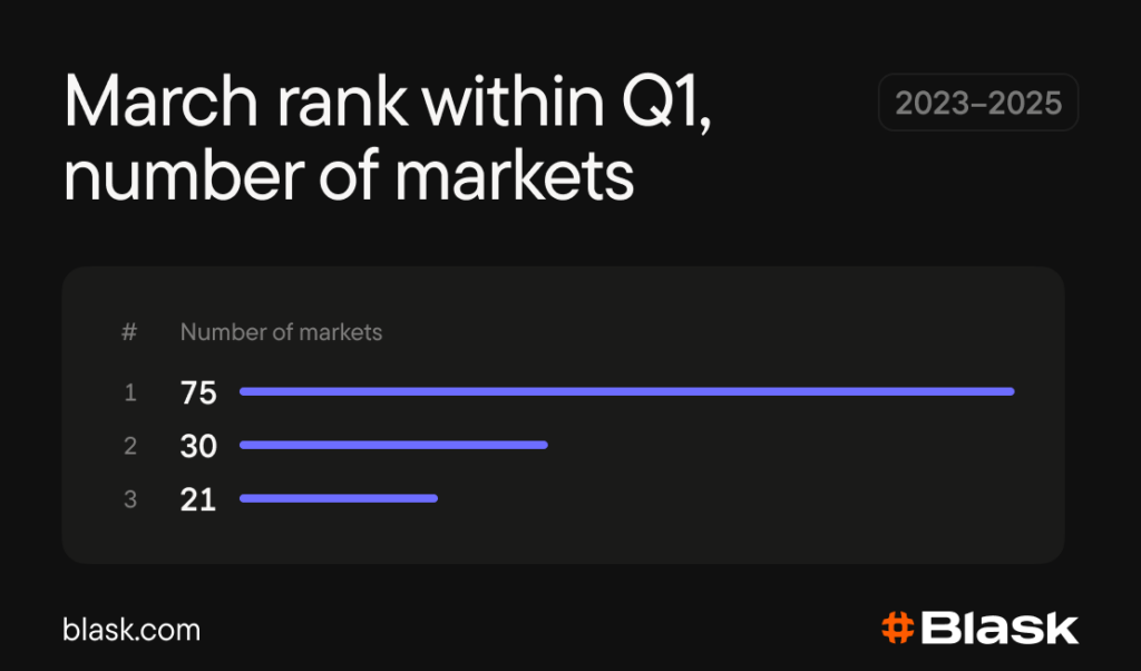 Blask seasonality data for 2023–2025 shows March as the best-performing Q1 month in most tracked markets. In many of them it holds the lead every year. But on a full-year scale, March mostly sits in the lower-middle of the ranking, and not a single market had it in the top three every year.