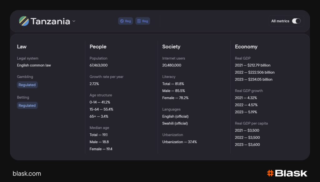 The Country Profile shows that both online casino and online betting are regulated in Tanzania. The page surfaces key economic and demographic indicators — population size, internet penetration, GDP per capita — giving the baseline context for market maturity.