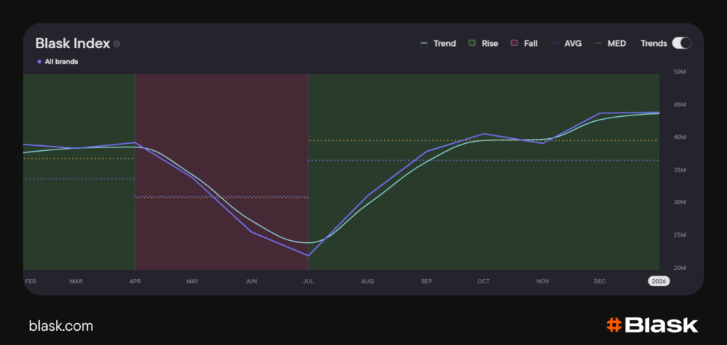 The Blask Index chart shows that user attention in Tanzania is rising. The click through to the Market Explanation feature helps understand why — whether growth is driven by regulatory changes, marketing spend, sports events, or shifting consumer behavior.