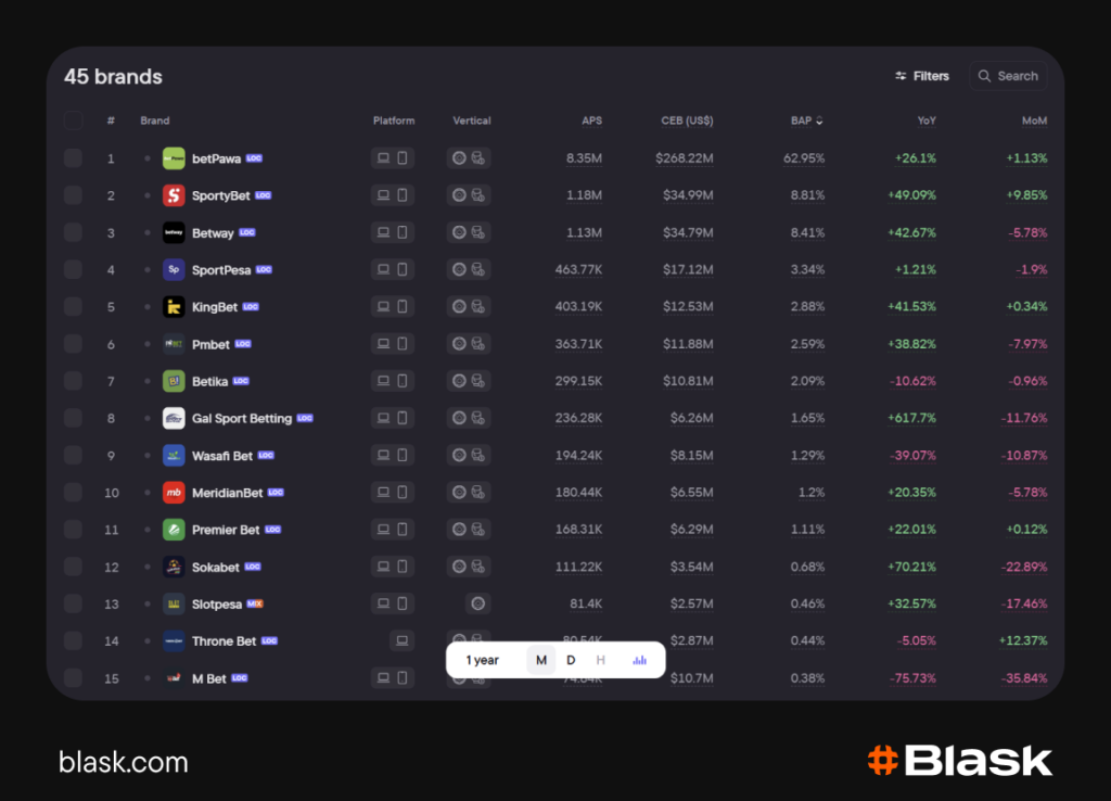 The Country’s Brands page lists active operators in Tanzania, information on their licence status, platforms they operate, their CEB and BAP, as well as their YoY and MoM performance.