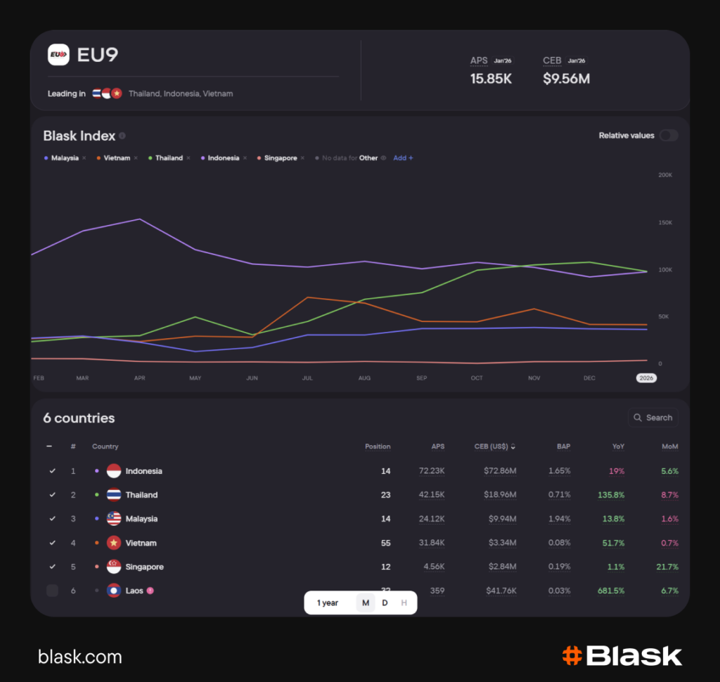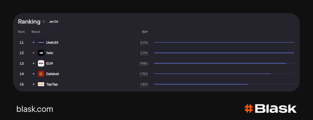 EU9`s close competitors in each country can be seen on its page. For example, as of January 2026 EU9 ranks in Malaysia between such globally known brands as 1win and Dafabet.
