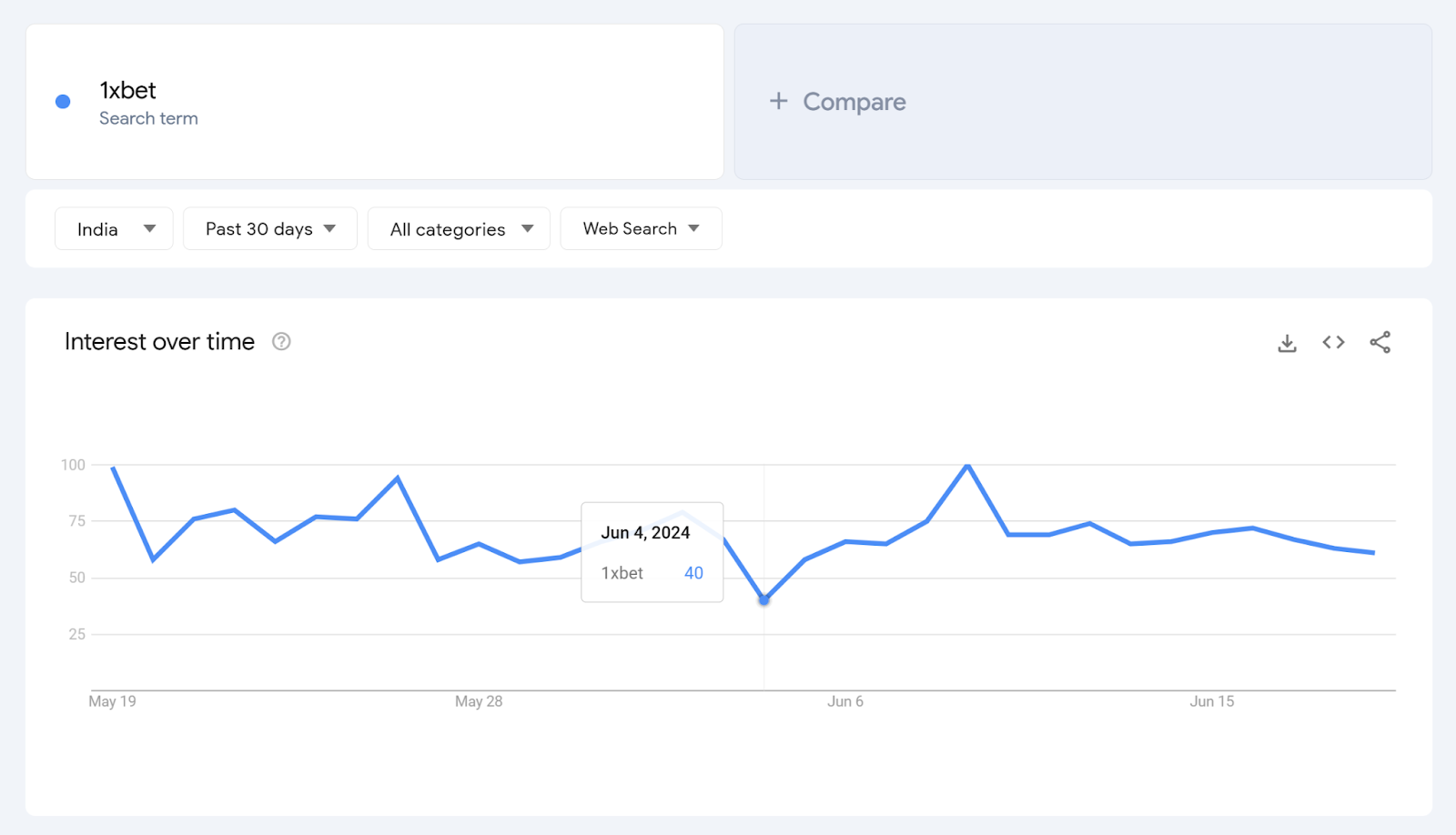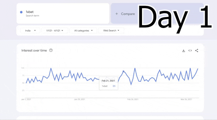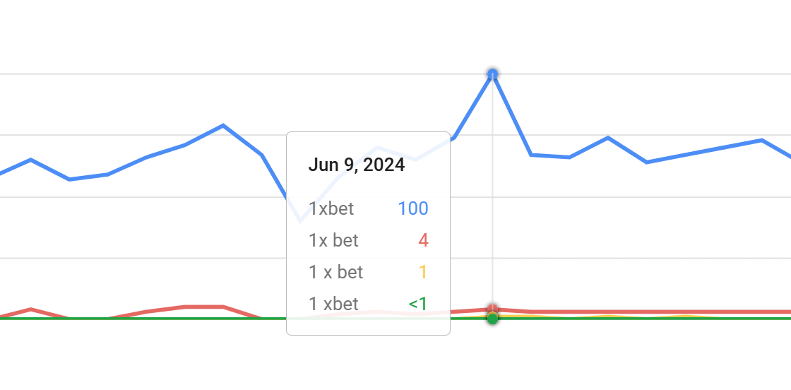 The problems begin with the fact that Google Trends sometimes gets confused with its own readings. We looked at the data for the query “1xbet” in the same country over the same period, but we did it a few days apart. Visually, the graphs are very similar, but the values differ slightly. In our example, the difference was between “89” and “78.” This discrepancy is too large to be attributed to a simple margin of error.
