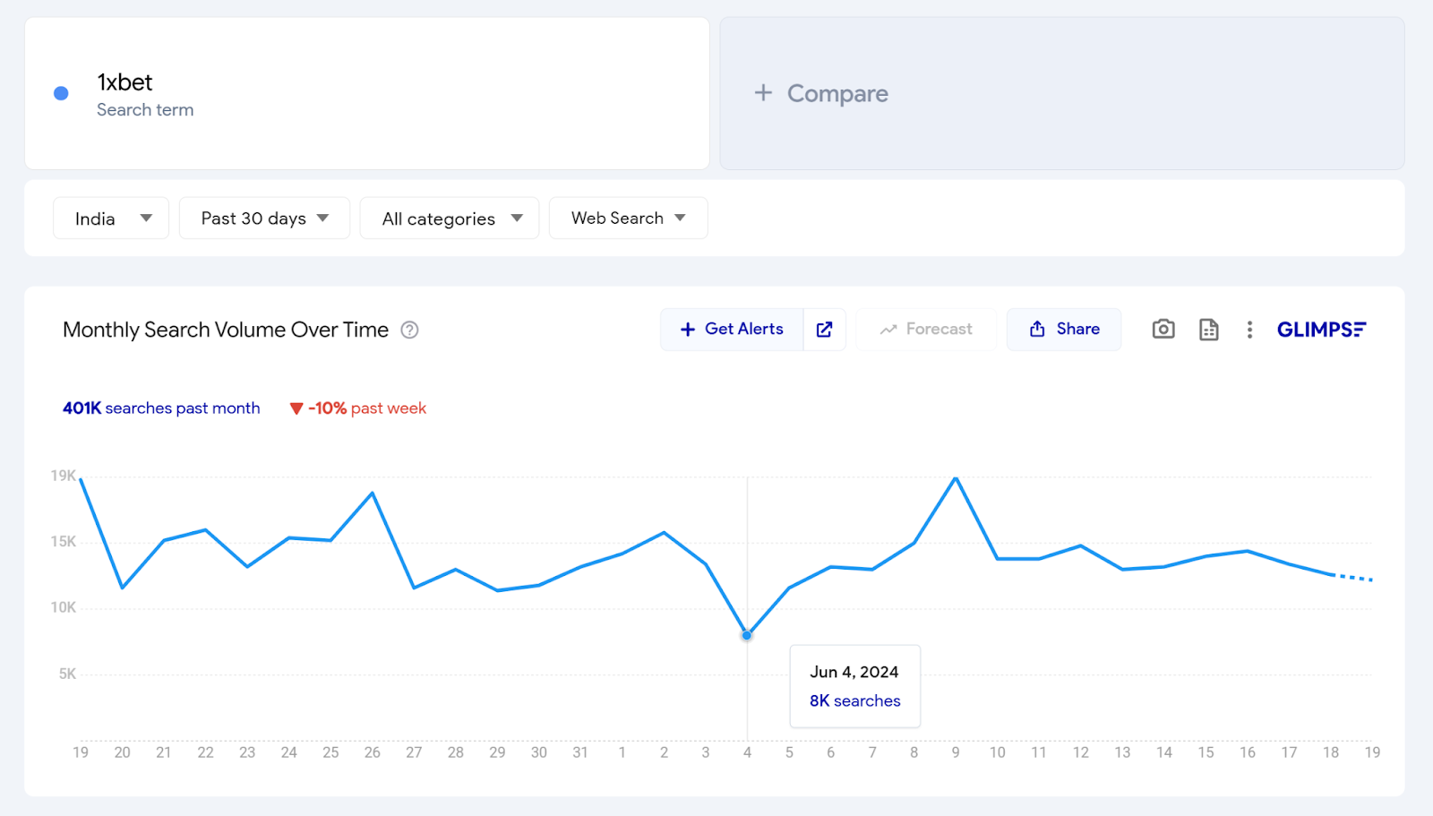 In the screenshot, there’s a difference between “1xbet”, “1 x bet”, “1x bet”, and “1 xbet.” A slight variation in spelling can result in a huge difference in the data. This means that you not only have to manually figure out the Share of Search for each brand through a complex process but also consider all alternative and incorrect spellings.