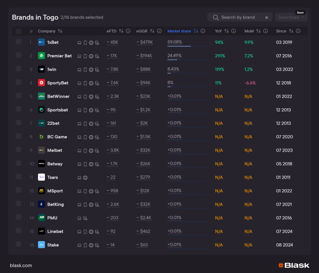 You can adjust the display of brands by Market Share, YoY growth, MoM growth, and eFTD. Additionally, you can filter by brands that offer casino options or sports betting, or view those with desktop or mobile versions available.
