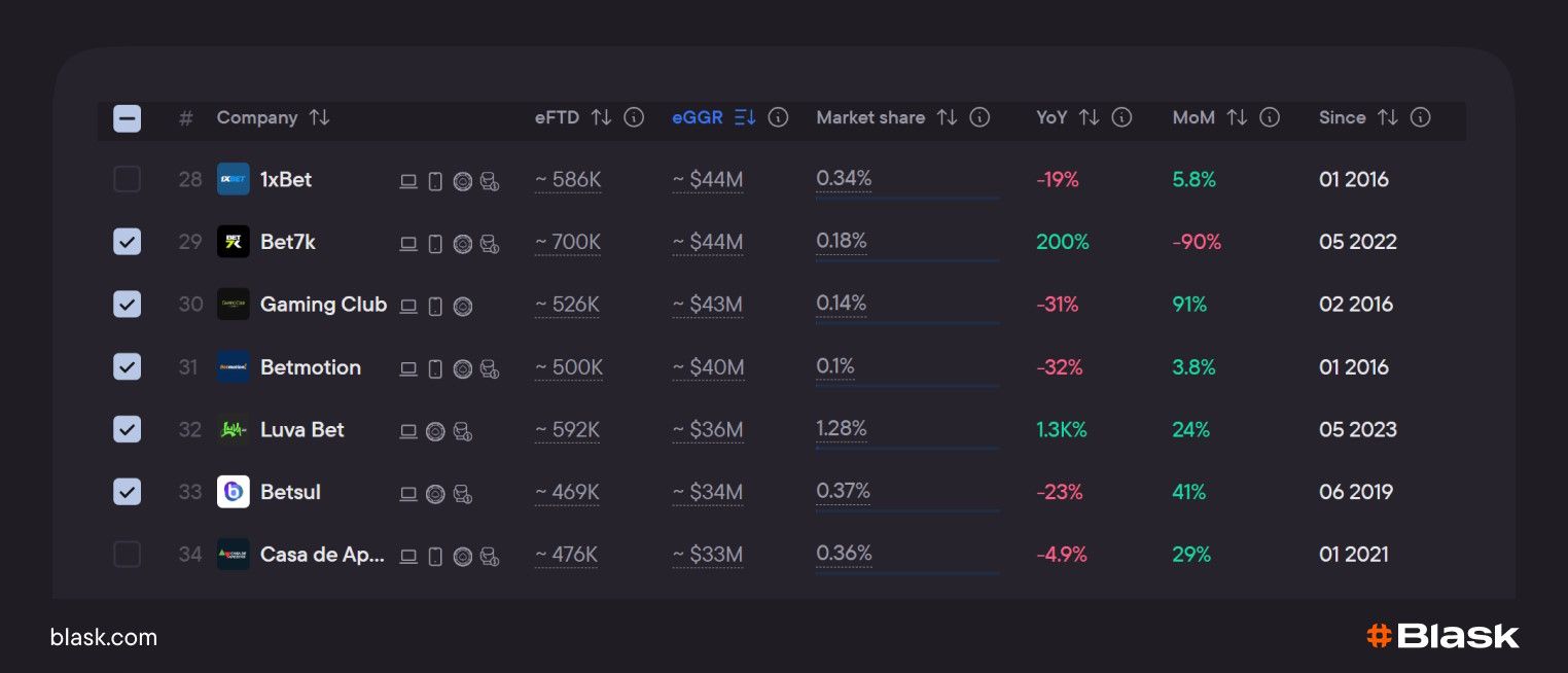 For example, let’s take the Brazilian brand Betmotion again and search for its closest competitors based on eGGR.