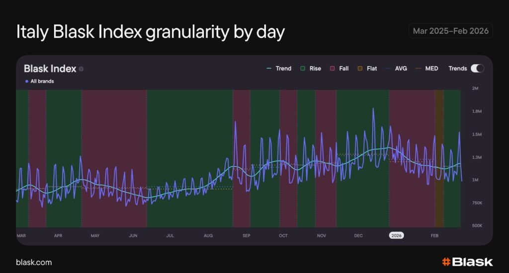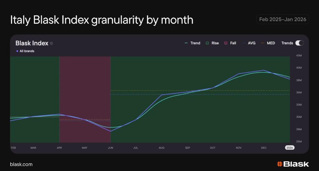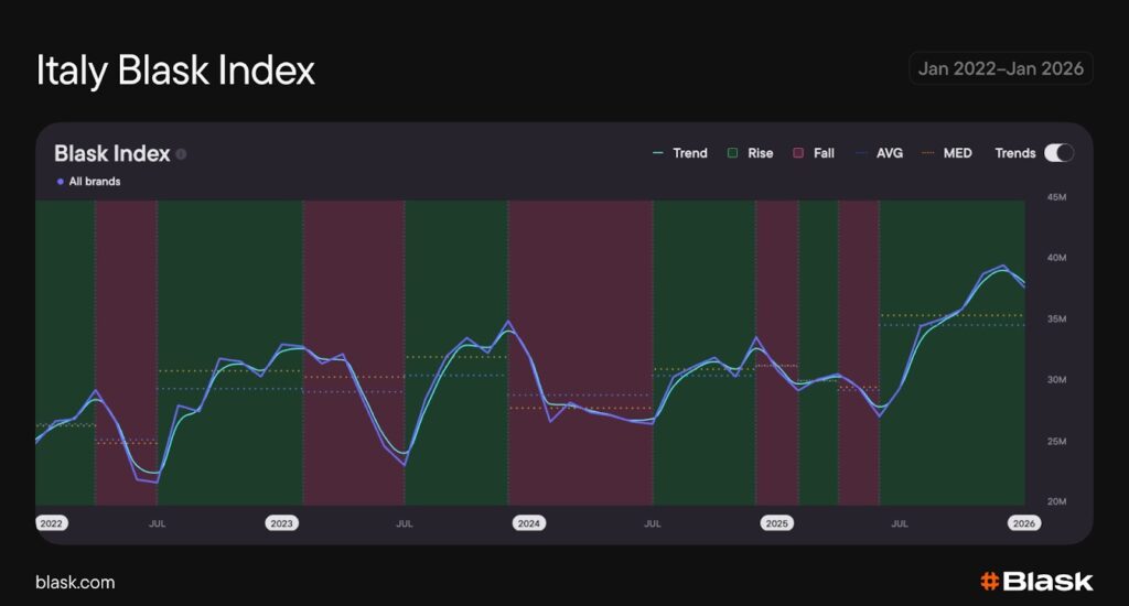 From February to June 2025, Italian Blask Index softened by roughly 7%, forming a clear spring trough. From there, the market reversed course: a steady recovery through late summer accelerated into autumn, lifting the Trend line by more than 35% from the seasonal low to its winter peak before stabilizing into early 2026. The overall shape is a classic U-recovery that transitions into an autumn staircase.
