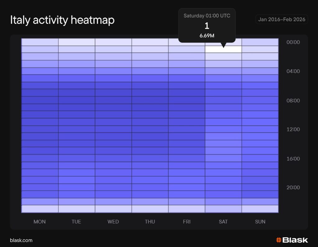 On a weekly basis, Italy shows a football-anchored structure — but the pattern is more nuanced than a simple “weekend spike” story.