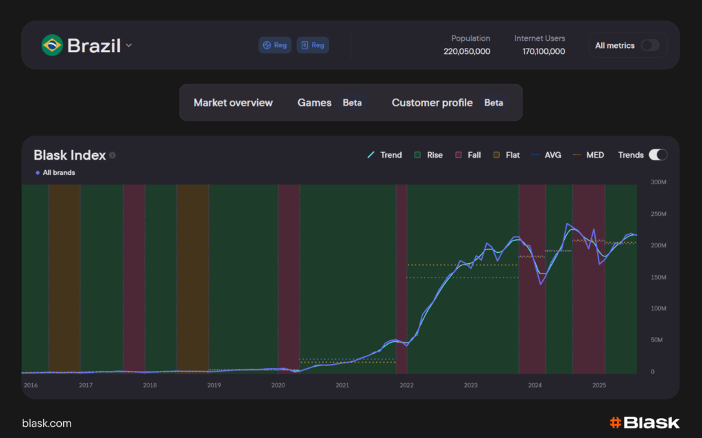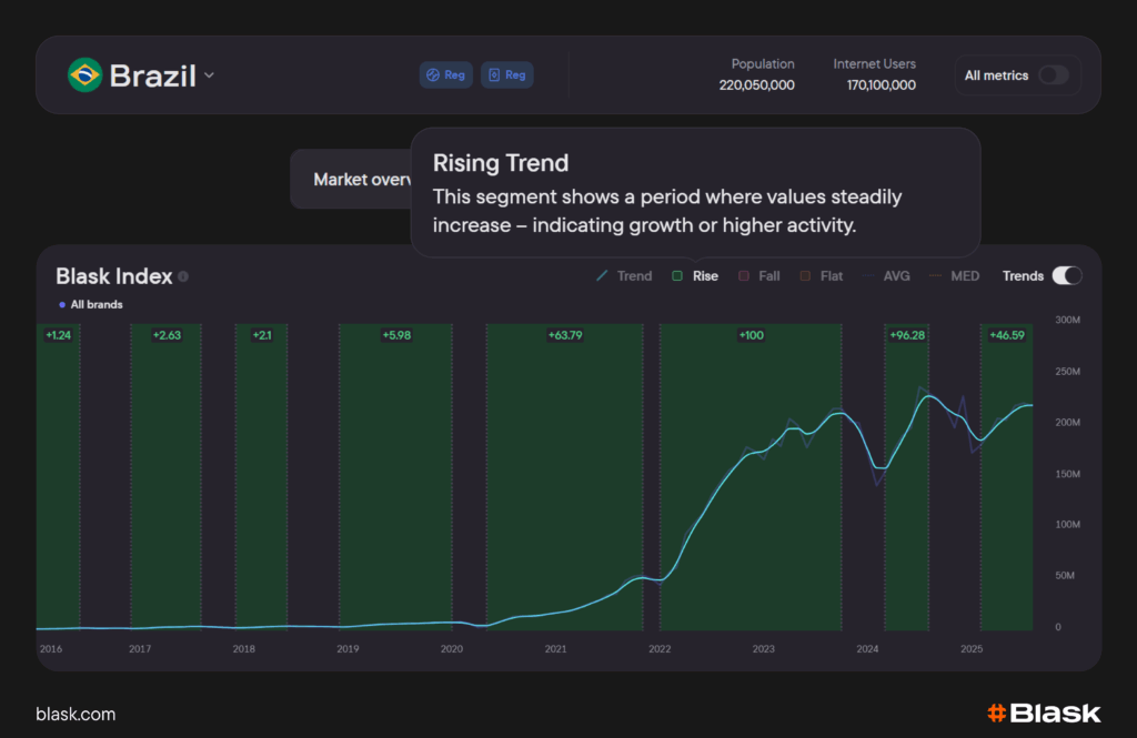 Trend well above baselines in a rising segment = real momentum; pulling back toward baselines = cooling. Use it for time campaigns, rotate budgets, spot inflection points, compare countries/brands apples-to-apples.
