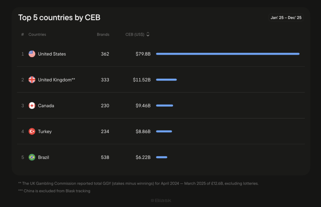 Total CEB across all US-tracked brands in 2025: $81 billion. The US market — a mix of state-licensed operators and offshore books — generates more nominal revenue than any other single-country market Blask tracks. By a large margin.