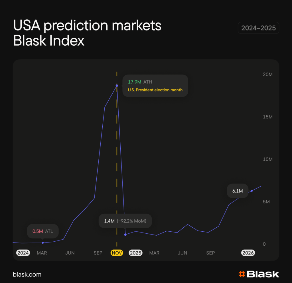 According to Blask data, after the 2024 US election spike, demand for prediction markets in the country slumped hard. By December 2025, Blask Index of prediction markets had fallen more than 92% month-over-month, exposing how dependent the category had been on the political cycle. Then it found a second leg. A move into sports prediction markets in the beginning of 2025 pushed the category’s Blask Index in the US up 256% from January to December 2025.